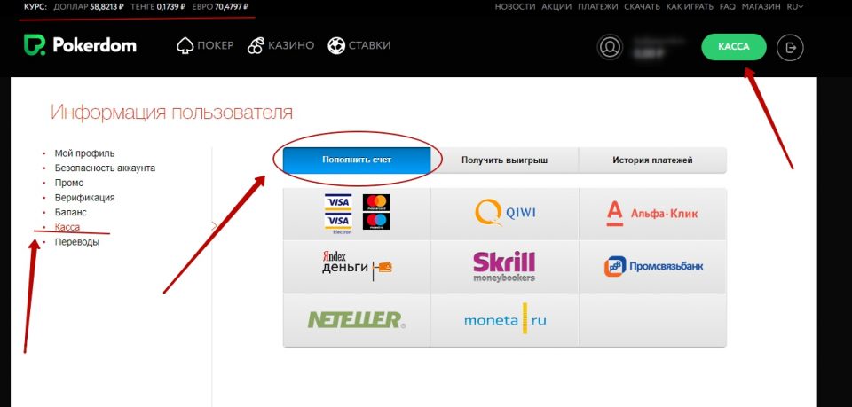 Вносить деньги в PokerDom игрок имеет право только в валюте, выбранной им при заполнении регистрационной анкеты. При выборе платежного инструмента необходимо учитывать не только удобство пополнения, но и все нюансы касательно вывода средств. Следует внимательно изучить условия проведения финансовых операций той или иной платежной системой, уточнив сроки обработки платежа и наличие комиссионного сбора.